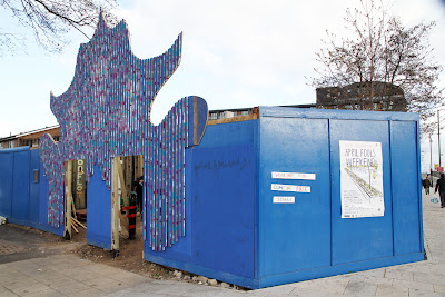 I've been working with the Canning Town Caravanserai team recently, towards this weekend's opening events. We made this six-and-a-half metre high entrance gate/billboard out of 6 cross laminated ply boards (cut according to a 1:1 template we made out of paper) covered in roofing battens -39p for 3metres- that we painted with good-old emulsion.